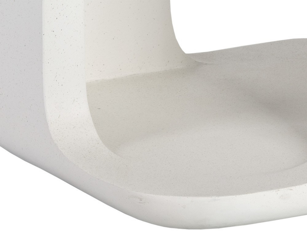 This modern end table from our Solterra collection will draw intrigue through any space. Features a white concrete base and a clear glass top. Suitable for indoor and covered outdoor spaces. Crafted from a natural concrete mix, each piece will look different, with variations of white hues that will enhance over time. Coordinating coffee table also available.