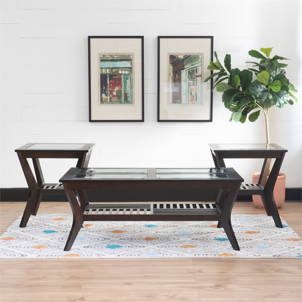 Lay The Groundwork For Lively Parties Or Relaxed Family Evenings With This Set Of Boho Tables. The Tempered Glass Tops Offer Long Term Durability And Lend To An Open Atmosphere In Areas You’D Like To Capitalize On Natural Light. Dramatic Curves In The Wooden Legs And Open Lower Shelves Made Of Alternating Slats Double Down On The Breezy Aesthetic, While The Brown Finish Leans Into Boho Charm. Both End Tables Support Up To 40 Lbs A Piece, And The Coffee Table Safely Holds Up To 100 Lbs.