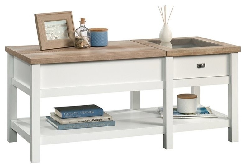 Create a coastal vibe in your living room with this lift-top coffee table from the collection. The partial top lifts up and forward to create a versatile work surface so you can browse online or eat dinner while relaxing on the couch. It also features hidden storage beneath the top, a lower open shelf for storage and display, and an easy-glide drawer with a glass display top for decor and memorabilia. Finished on all sides in Soft White with a Lintel Oak accent, this versatile coffee table will give your home a fresh new look.