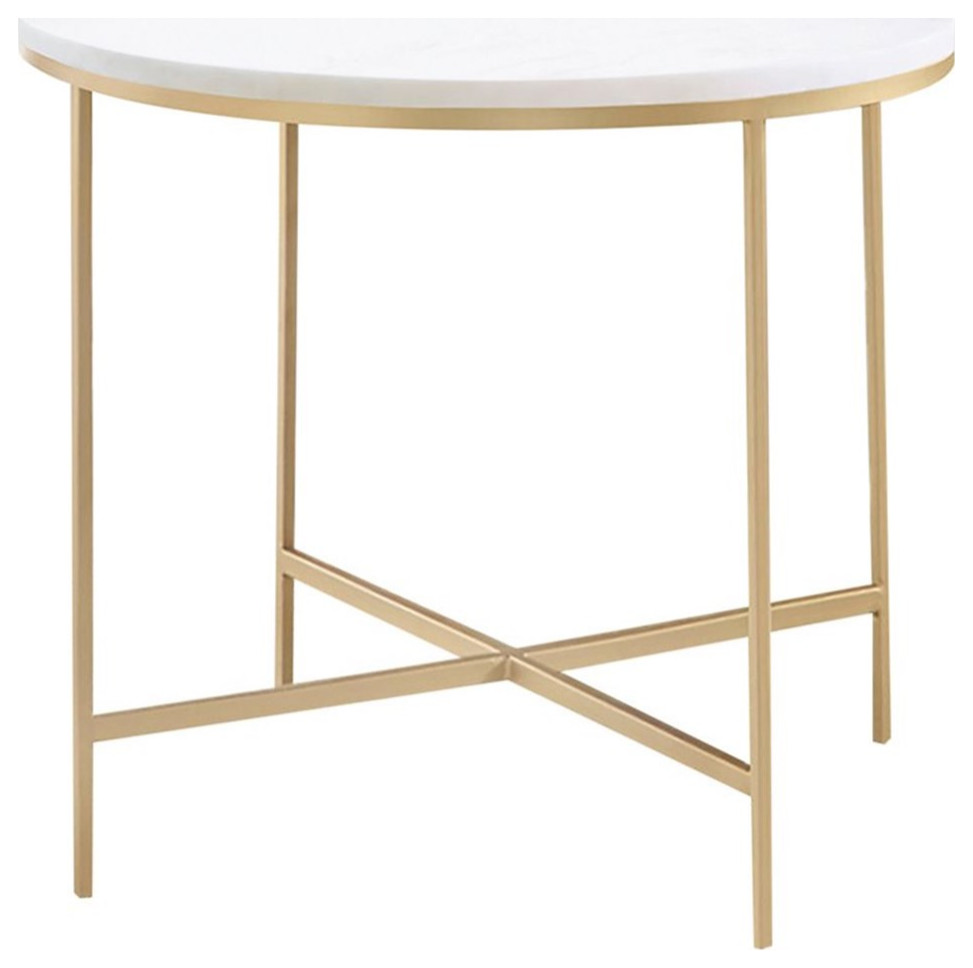 Smooth and sleek, this round end table is just what you need for your table lamp or decor. The round marble tabletop is a gorgeously elegant upgrade for this piece, featuring hues of white and handcrafted in India. The stylish and thin table legs offer top-notch function. Meanwhile, the striking gold finish of the metal legs provides a finishing touch. If only every end table offered such simplistic design combined with elegant aesthetics.