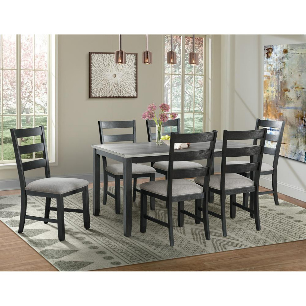 Picket House Furnishings Kona Standard Height Side Chair Set in Black are the perfect chairs for dining or entertaining. The chairs feature a ladder back design and an upholstered seat in a gray fabric. The wire brush, black finish on the chairs is truly unique, adding instant flair to this set. Filled with high density foam for comfortable dining. The gray upholstery contrasts well with the black base and will give the updated look your dining room has been craving!