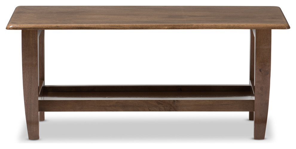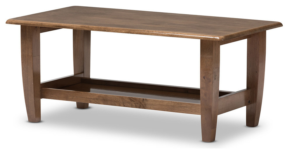 The look of your living room will be dramatically enhanced by Pierce mid-century modern walnut finished wood coffee table. Wood is the best in style and class of any living room upholstery. Featuring mid-century retro modern design, the Pierce coffee table is constructed of eco-friendly solid rubberwood and rubberwood veneer. Inspired by mid-century modern style, the coffee table features strong and durable ready-to-assemble construction with a solid open shelf for magazines and books. Supported by chunky wood blocks on four sides, the table, with beveled edge is finished in dark walnut finishing. The table looks great from all angles, whether in a lounge arrangement, public waiting area or private office. Made in Malaysia, the occasional coffee table requires assembly.