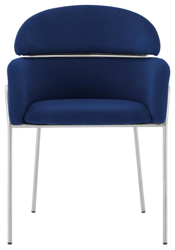 The Portia Blue Fabric Dining Chair from Armen Living is uniquely designed, but perfect for your home. The wide seat and high chair back and arms will encapsulate your body and make you feel stable and secure. The incredibly plush foam-padded cushion will keep you relaxed all day long and make you comfortable for as long as youre seated. The stainless-steel frame can be seen throughout this piece - present for aesthetic as well as strength. The Portia Dining Chair is available in your color choice of Grey or Blue fabric. Comes in a set of 2 dining chairs.
