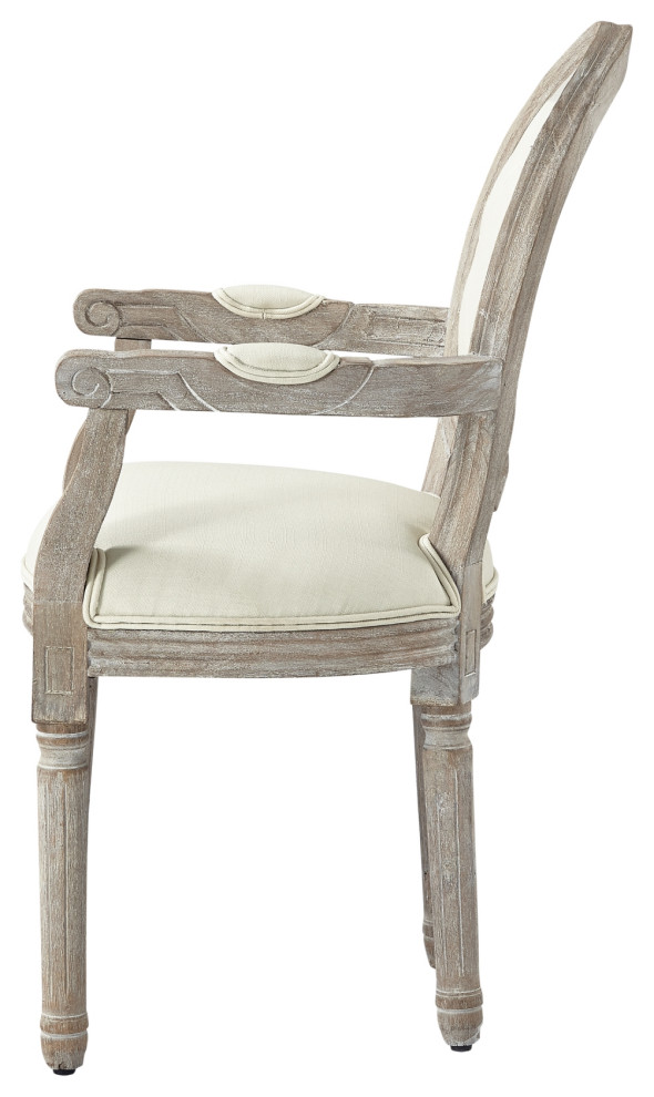 Your kitchen and dining room are the places to bond and exchange conversations with your friends and family. Our dining chair with arms, upholstered in a luxurious linen fabric, features a button-tufted backrest. This dining chair can add elegance to your kitchen or dining room with its oval back and the antique brushed wood finish, that completes the French-inspired look of your home.