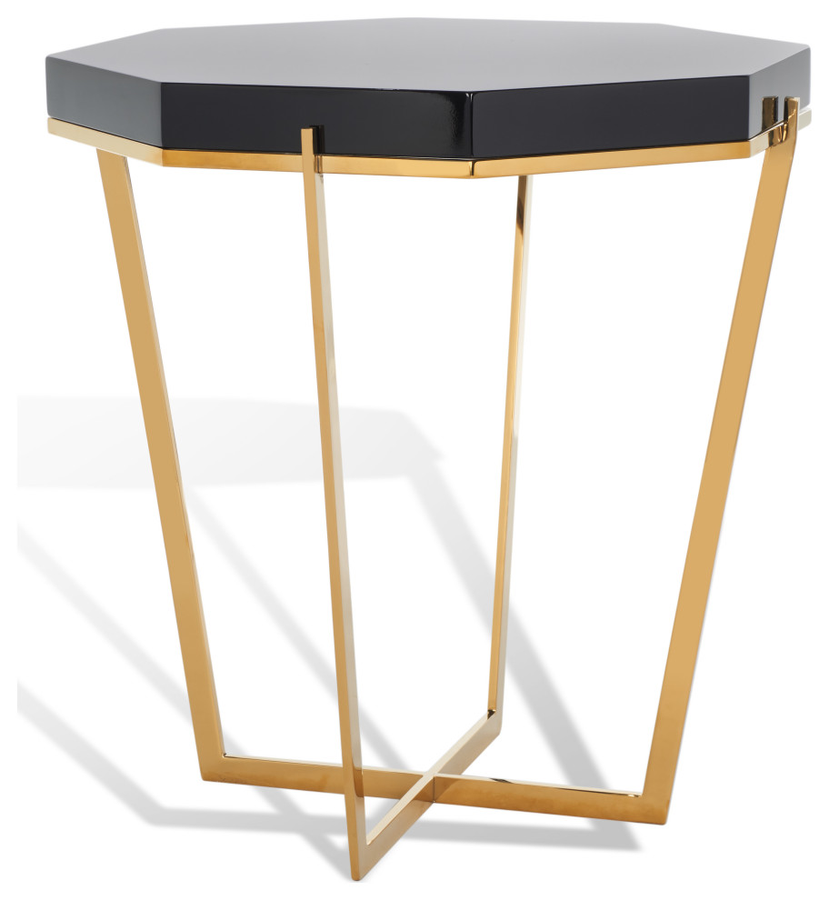 The Danna end table sports a black lacquered wood top in an eye-catching hexagonal design that is pure sophistication. With thin straight legs crossing at its base and apron of brass plated stainless steel, this table is elegant beside a sofa or chair.