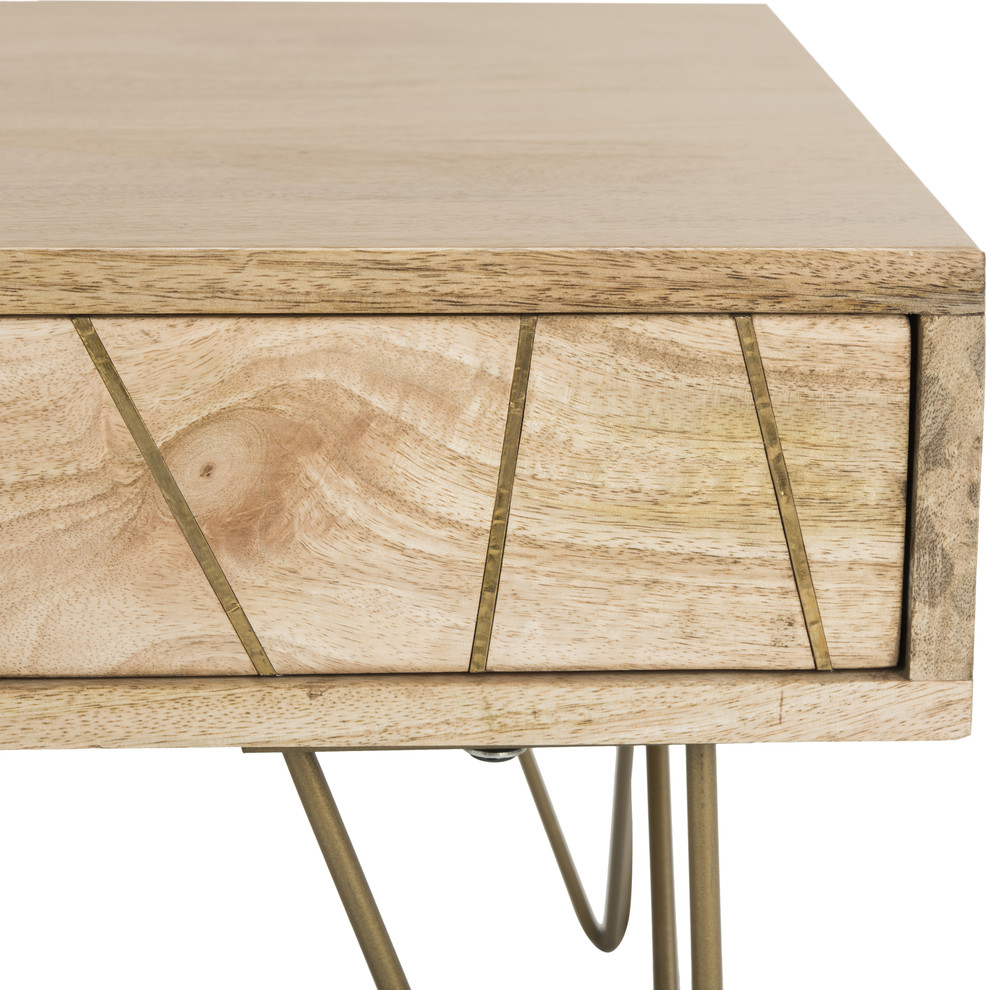 A natural beauty, this contemporary coffee table makes a grand statement in the living room. Inspired by master craftsmen, it was designed with natural mango wood and paired with geometric hairpin legs finished in brass. Designers love its ample storage drawer.