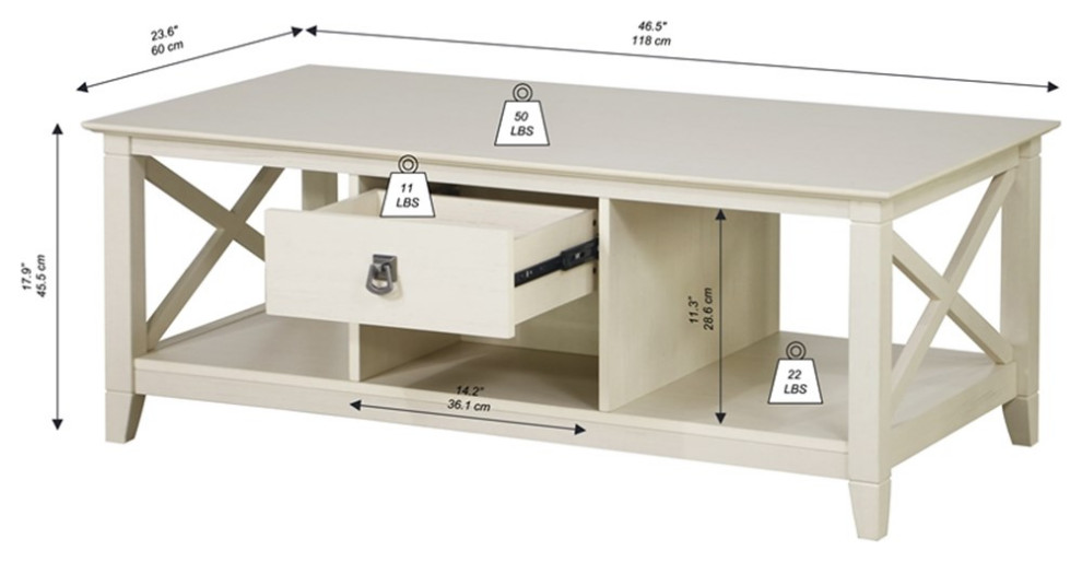 Embrace farmhouse charm with this eye-catching modern wood coffee table. In soft antique white, it offers a clean, attractive look that brims with character and storage. One drawer and three shelves create multiple spaces for stashing essentials and showing off favorite books and other decor. X-brace accents add farmhouse character to the casual contemporary design, making it a charming choice in a rustic or coastal design scheme.
