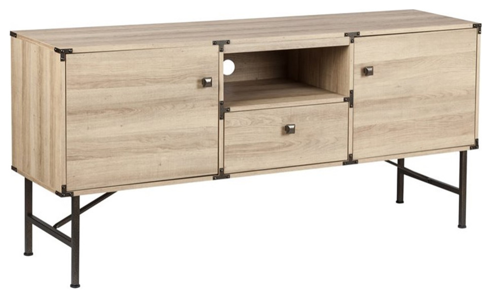 Update your office space with a handy organizational must-have. Equipped with a center drawer and an open storage cubby, this light oak finished file cabinet makes it easy to keep workday essentials neatly put together. The expansive, rectangular surface allows it to double as a desk. The sleek metal legs and metal bracket accents add a cool, industrial touch to the design.