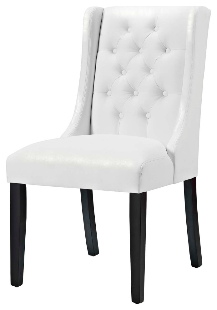 Bestow splendor with Baronet. Charm and elegance adorn this luxurious button tufted dining chair complete with sleek curves and dignified form. Featuring dense foam padding, fine vinyl upholstery, a solid wood frame, and non-marking foot glides, Baronet is a stylish dining chair perfect for the modern home.