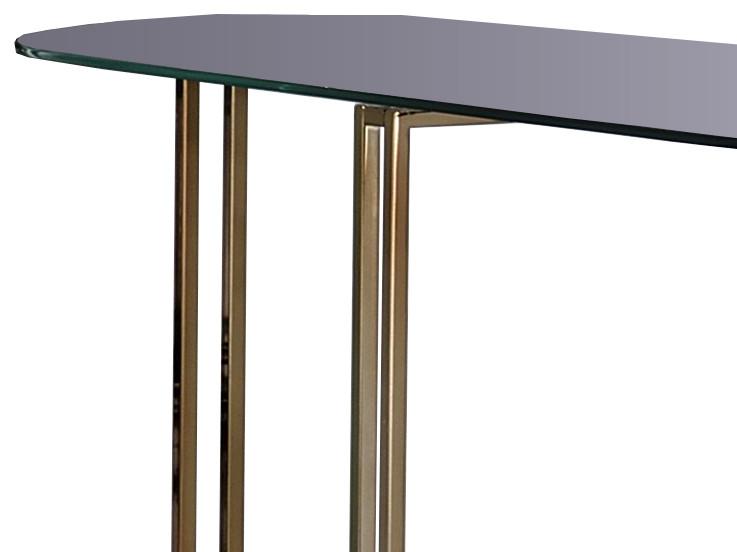 Live a sophisticated and luxurious lifestyle with the inclusion of this contemporary sofa table. It features a metal frame in champagne finish, enclosing a capsule shape open bottom shelf and a tabletop, both made from 8mm clear tempered glass.