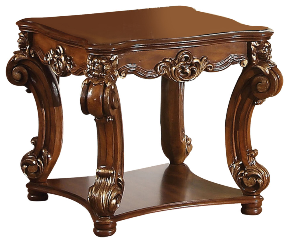 Bringing a sense of traditionally vintage looking arrangement is possible with this perfect inclusion. With a completely wood finish, this Victorian design end table features a complete cherry brown finish with scrolled trim accents throughout for a unique look and scrolled legs giving a clean elegant style. Sturdily made with solid wood, this end table features bottom shelf underneath for storage space. This is perfect to give character to any setting in your living room or bedroom. Does not include any featured product other than one end table only.