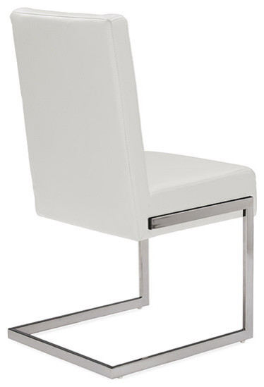 Baxton Studio Toulan Modern and Contemporary White Faux Leather Upholstered Stainless Steel Dining Chair. High-polished stainless steel sled base frame gives Toulon dining chair a striking silhouette, and the feel is actually quite comfortable. Thanks to the extra thick cushion covered in durable white faux leather, Toulon dining chair will bring a sophisticated modern look to your dining room or kitchen space at an affordable price. The Toulan side chair is an elegant combination of modern design and comfort. Made in China, the dining chair requires assembly.