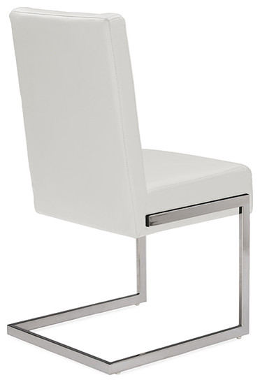 High-polished stainless steel sled base frame gives Toulon dining chair a striking silhouette, and the feel is actually quite comfortable. Thanks to the extra thick cushion covered in durable white faux leather, Toulon dining chair will bring a sophisticated modern look to your dining room or kitchen space at an affordable price. The Toulan side chair is an elegant combination of modern design and comfort. Made in China, the dining chair requires assembly.