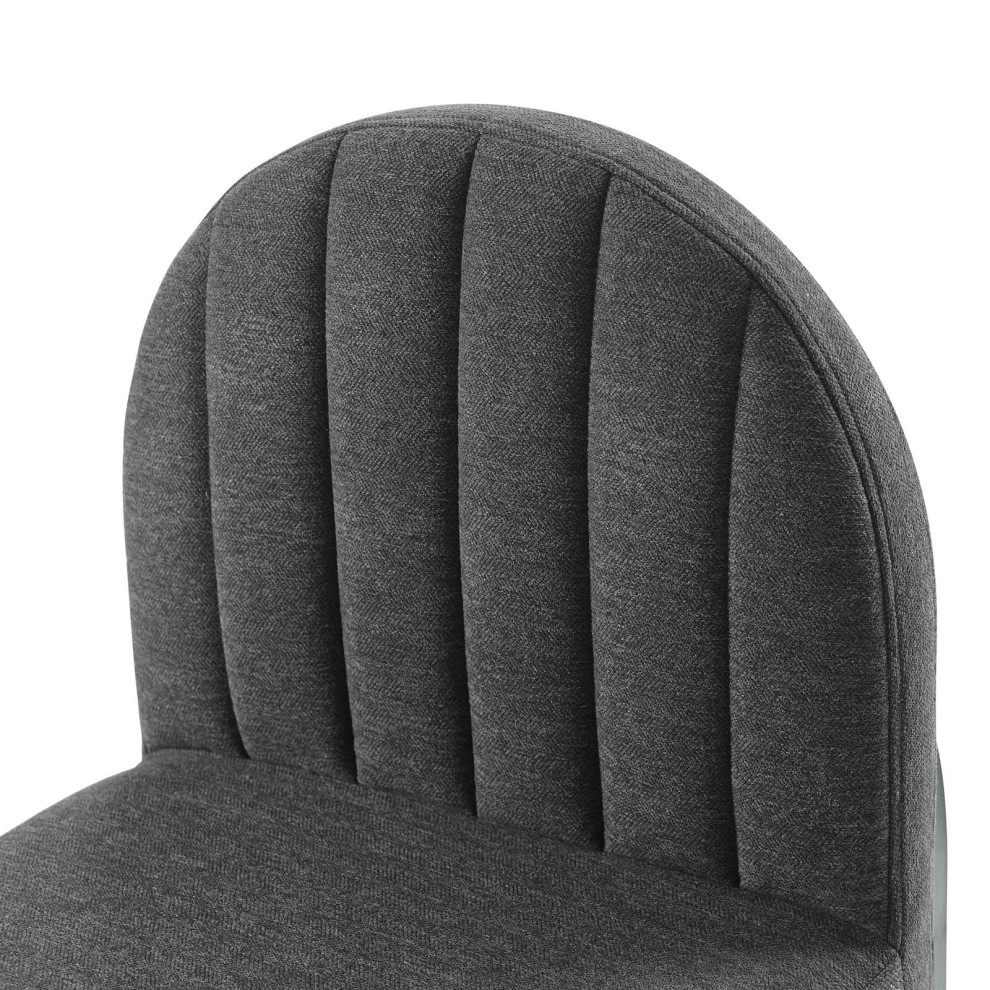 Reinvent your dining room decor with the vintage glamour of the Isla Channel Tufted Upholstered Fabric Dining Room Side Chair. Featuring a vintage clamshell design and the bold lines of channel tufted accents, the Isla Dining Accent Chair is a piece to be remarked upon by guests and friends. Dense foam padding provides a comfortable seat, while soft and durable polyester fabric upholstery creates a luxe elegance for long-lasting use. The curved matte black stainless steel frame on the Isla Side Chair has four legs with non marking foot caps to protect flooring. Chair Weight Capacity: 331 lbs.
