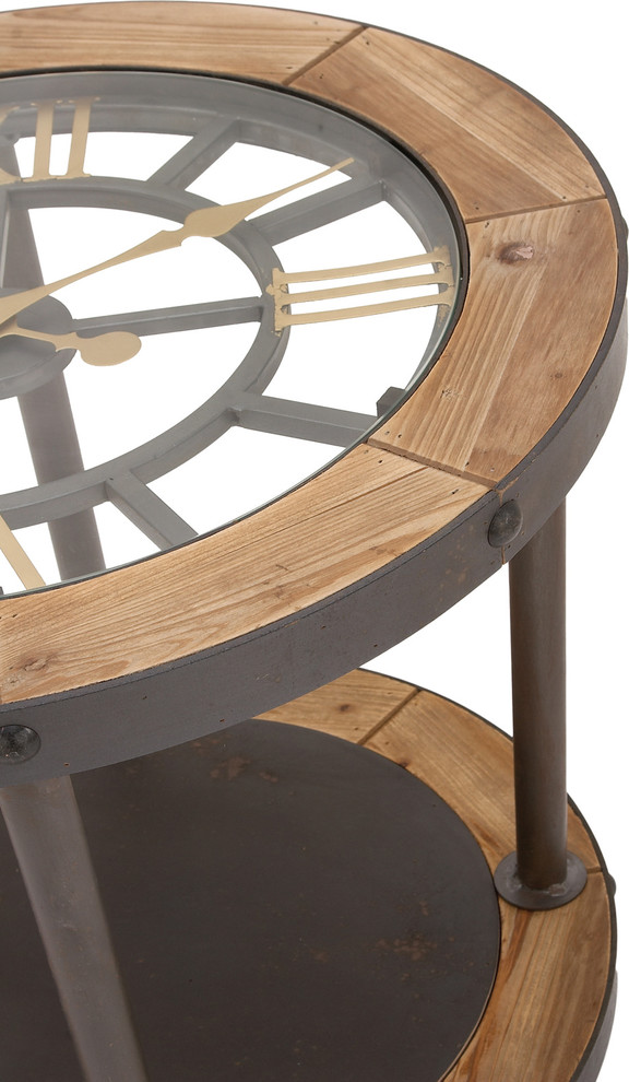 Inject some character and style into your living space with this bold clock accent table. A clear glass top covers a distinctive clock face with gold roman numerals and metal framing with natural cypress wood accents. The base of the table is an industrial design with a dark gray wrought iron finish and rests on caster wheels so you move this table where it will best serve your needs. Imported.