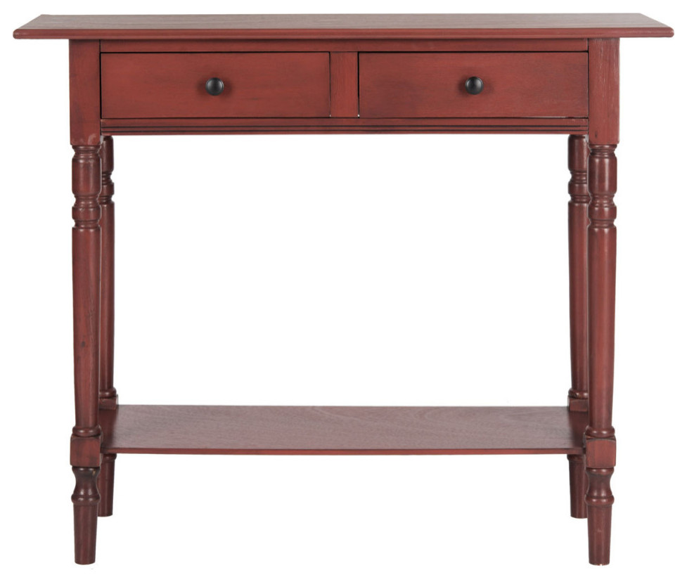 Traditional good taste is beautifully transformed for today's classic-contemporary interiors in this romantic Vada Console. A rusty red finish perfectly highlights Vada's turned spindle legs, while two drawers and a lower shelf provide ample storage and display in any room.