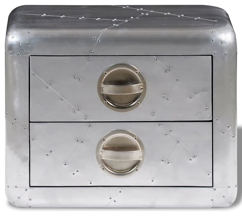 This high-quality aviator side table can be placed in any room. Thanks to the sleek and compact design, it can also be used as a coffee table, a bedside table, an end table, etc. This aircraft side table has two drawers for small items like keys, notepads, pens, and other knick-knacks. The tabletop can be used to place food or drinks or to display decorative objects like photo frames, or even potted plants. This airmen side table is made of solid wood and its surface is clad with a patchwork of polished aluminum panels, accented with exposed steel screws, which makes it extremely durable. Smooth edges and the retro drawer handles give the aviator side table a unique look.