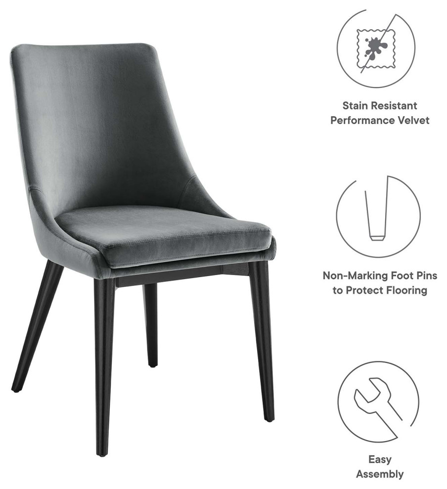 Revitalize your dining decor with the Viscount Dining Chair. Graceful, minimalist lines blend seamlessly with the lush comfort of Viscount soft, stain-resistant performance velvet upholstery, dense foam padding, and rests atop black rubberwood tapered legs. Viscount versatile vintage modern style makes this ideally suited for a variety of rooms. Place Viscount in the dining room or kitchen as a dining chair, or in the living room, entryway, or bedroom as an accent chair. This modern accent dining chair supports up to 300 lbs. and includes non-marking foot caps to protect flooring.