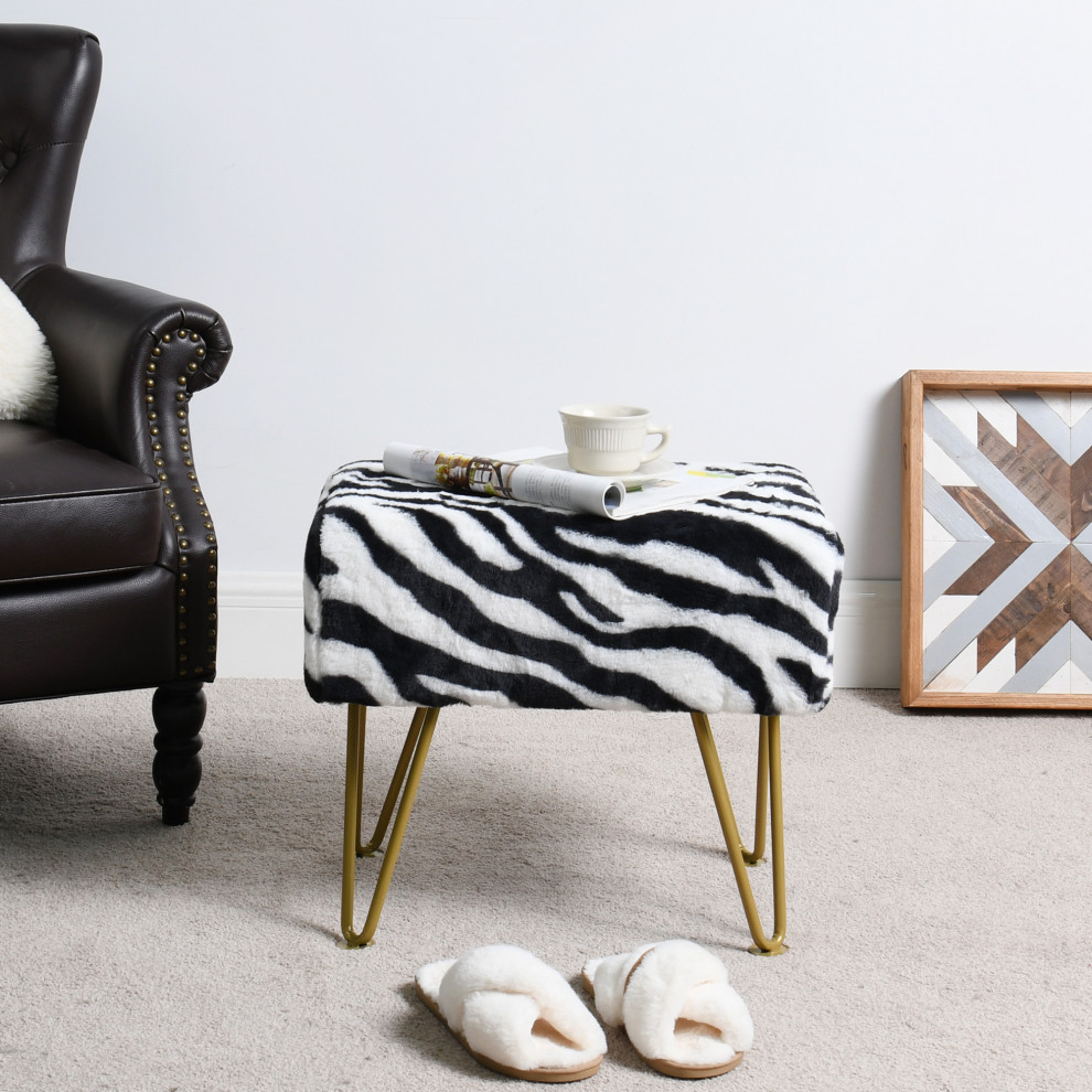 Put your feet up on a faux fur cushion and descend into pure relaxation and comfort. The zebra print featured with gold legs are eye-catching and outstanding which can be a spot in your house. Upholstered with soft faux fur, this ottoman offers a blend of comfort and function to a home's living room. The animal ottoman can serve as extra sitting or vanity stool and, with the correct styling, as a coffee table where you can put books, a drink, or other accessories.